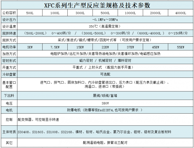 材質一般有碳錳鋼、不銹鋼、鋯、鎳基(哈氏、蒙乃爾、因康鎳)合金等有色金屬及其它復合材料,加熱/降溫方式,可分為電加熱、熱水加熱、導熱油循環(huán)加熱、蒸汽加熱、遠紅外加熱、外(內)盤管加熱、電磁感應加熱等,夾套降溫和釜內盤管降溫等。加熱方式的選擇主要跟化學反應所需的加熱/降溫溫度,以及所需熱量大小有關。攪拌器有錨式、框式、槳式、渦輪式,刮板式,組合式等多層復合槳。根據(jù)不同工作環(huán)境的工藝需要進行設計、制造。